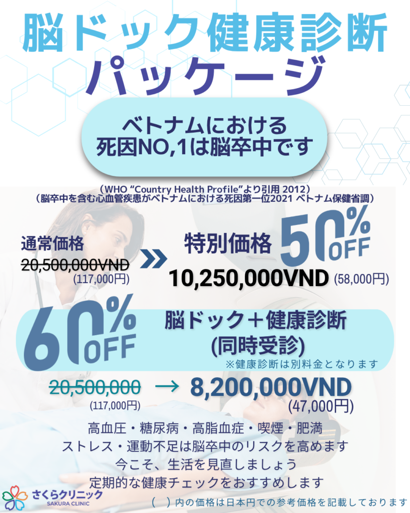 | 脳ドック(単独受診) | 20,500,000VND(117,000円*) | 10,250,000VND(58,000円*) | 50% OFF |
