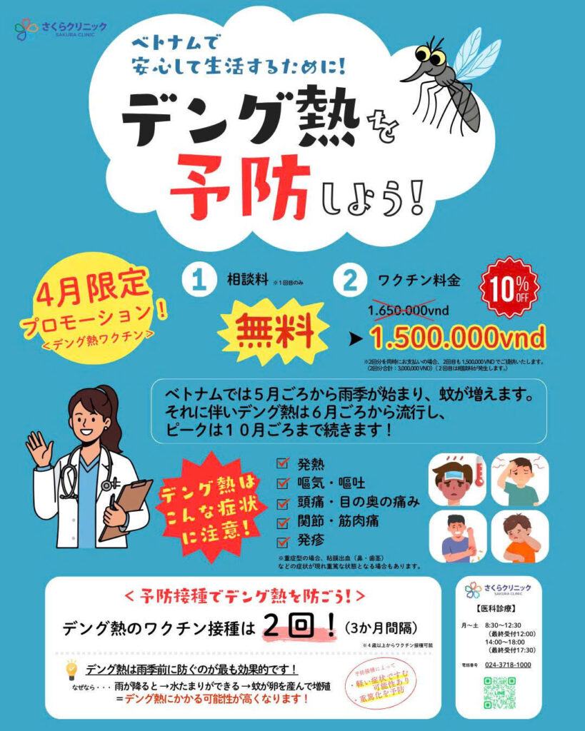 2026.04.01ベトナムではデング熱の流行が懸念されます。 さくらクリニックでは、デング熱ワクチン(QDENGA)の接種を開始いたしました。